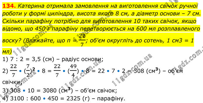 Катерина отримала замовлення на виготовлення свічок ручної роботи у формі циліндра, висота якого 8 см, а діаметр основи – 7 см. Скільки парафіну потрібно для виготовлення 10 таких свічок, якщо відомо, що 450 г парафіну перетворюється на 600 мл розплавленого воску? (Вважайте, що п = 22/7; об'єм округліть до сотень, 1 см3 = 1 мл) 1) 7 : 2 = 3,5 (см) – радіус основи; 2) 22/7 • (7/2)2 • 8 = 22/7 • (49/4) • 8 = 22 • 7 • 2 = 308 (см3) – об’єм свічки; 3) 308 • 10 = 3080 (см3) – об’єм свічок; 4) 3100 : 600 • 450 = 2325 (г) – парафіну.
