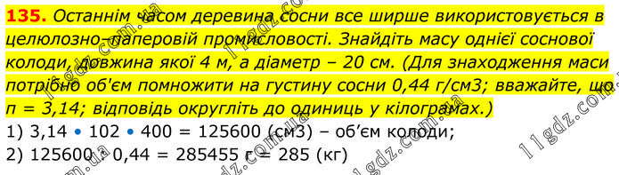 Останнім часом деревина сосни все ширше використовується в целюлозно–паперовій промисловості. Знайдіть масу однієї соснової колоди, довжина якої 4 м, а діаметр – 20 см. (Для знаходження маси потрібно об'єм помножити на густину сосни 0,44 г/см3; вважайте, що п = 3,14; відповідь округліть до одиниць у кілограмах.) 1) 3,14 • 102 • 400 = 125600 (см3) – об’єм колоди; 2) 125600 : 0,44 = 285455 г = 285 (кг)