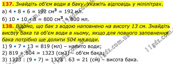 137. Знайдіть об'єм води в баку. Укажіть відповідь у мілілітрах. а) 4 • 8 • 6 = 192 см3 = 192 мл. б) 10 • 10 • 8 = 800 см3 = 800 мл. 138. Відомо, що бак з водою наповнено на висоту 13 см. Знайдіть висоту бака та об'єм води в ньому, якщо для повного заповнення бака потрібно ще долити 504 мл води. 1) 9 • 7 • 13 = 819 (мл) – наповнено води; 2) 819 + 504 = 1323 (см3) – об'єм бака; 3) 1323 : (9 • 7) = 1323 : 63 = 21 (см) – висота бака.