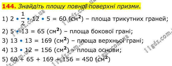 Знайдіть площу повної поверхні призми. 1) 2 • 1/2 • 12 • 5 = 60 (см2) – площа трикутних граней; 2) 5 • 13 = 65 (см2) – площа бокової грані; 3) 13 • 13 = 169 (см2) – площа верхньої грані; 4) 13 • 12 = 156 (см2) – площа основи; 5) 60 + 65 + 169 + 156 = 450 (см2)
