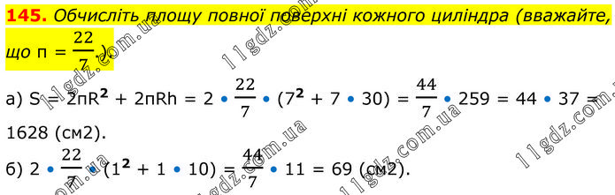 Обчисліть площу повної поверхні кожного циліндра (вважайте, що π = 22/7.). а) S = 2πR2 + 2πRh = 2 • 22/7 • (72 + 7 • 30) = 44/7 • 259 = 44 • 37 = 1628 (см2). б) 2 • 22/7 • (12 + 1 • 10) = 44/7 • 11 = 69 (см2).