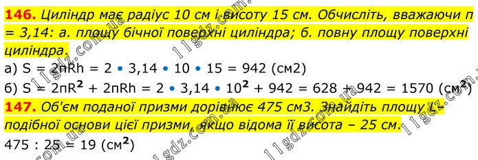 146. Циліндр має радіус 10 см і висоту 15 см. Обчисліть, вважаючи π = 3,14: а. площу бічної поверхні циліндра; б. повну площу поверхні циліндра. а) S = 2πRh = 2 • 3,14 • 10 • 15 = 942 (см2) б) S = 2πR2 + 2πRh = 2 • 3,14 • 102 + 942 = 628 + 942 = 1570 (см2) 147. Об'єм поданої призми дорівнює 475 см3. Знайдіть площу L–подібної основи цієї призми, якщо відома її висота – 25 см. 475 : 25 = 19 (см2)