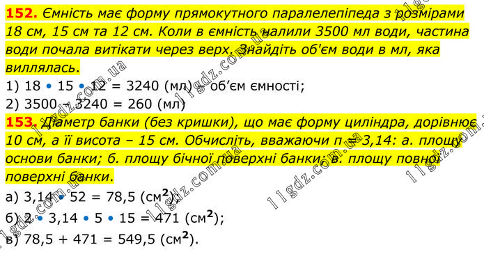 152. Ємність має форму прямокутного паралелепіпеда з розмірами 18 см, 15 см та 12 см. Коли в ємність налили 3500 мл води, частина води почала витікати через верх. Знайдіть об'єм води в мл, яка виллялась. 1) 18 • 15 • 12 = 3240 (мл) – об’єм ємності; 2) 3500 – 3240 = 260 (мл) 153. Діаметр банки (без кришки), що має форму циліндра, дорівнює 10 см, а її висота – 15 см. Обчисліть, вважаючи π = 3,14: а. площу основи банки; б. площу бічної поверхні банки; в. площу повної поверхні банки. а) 3,14 • 52 = 78,5 (см2); б) 2 • 3,14 • 5 • 15 = 471 (см2); в) 78,5 + 471 = 549,5 (см2).
