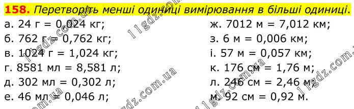 Перетворіть менші одиниці вимірювання в більші одиниці. а. 24 г = 0,024 кг; б. 762 г = 0,762 кг; в. 1024 г = 1,024 кг; г. 8581 мл = 8,581 л; д. 302 мл = 0,302 л; е. 46 мл = 0,046 л; ж. 7012 м = 7,012 км; з. 6 м = 0,006 км; і. 57 м = 0,057 км; к. 176 см = 1,76 м; л. 246 см = 2,46 м; м. 92 см = 0,92 м.