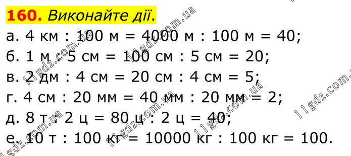 Виконайте дії. а. 4 км : 100 м = 4000 м : 100 м = 40; б. 1 м : 5 см = 100 см : 5 см = 20; в. 2 дм : 4 см = 20 см : 4 см = 5; г. 4 см : 20 мм = 40 мм : 20 мм = 2; д. 8 т : 2 ц = 80 ц : 2 ц = 40; е. 10 т : 100 кг = 10000 кг : 100 кг = 100.