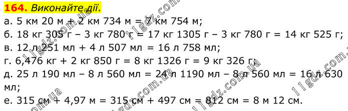 Виконайте дії. а. 5 км 20 м + 2 км 734 м = 7 км 754 м; б. 18 кг 305 г – 3 кг 780 г = 17 кг 1305 г – 3 кг 780 г = 14 кг 525 г; в. 12 л 251 мл + 4 л 507 мл = 16 л 758 мл; г. 6,476 кг + 2 кг 850 г = 8 кг 1326 г = 9 кг 326 г; д. 25 л 190 мл – 8 л 560 мл = 24 л 1190 мл – 8 л 560 мл = 16 л 630 мл; е. 315 см + 4,97 м = 315 см + 497 см = 812 см = 8 м 12 см.