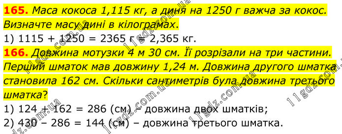 165. Маса кокоса 1,115 кг, а диня на 1250 г важча за кокос. Визначте масу дині в кілограмах. 1) 1115 + 1250 = 2365 г = 2,365 кг. 166. Довжина мотузки 4 м 30 см. Її розрізали на три частини. Перший шматок мав довжину 1,24 м. Довжина другого шматка становила 162 см. Скільки сантиметрів була довжина третього шматка? 1) 124 + 162 = 286 (см) – довжина двох шматків; 2) 430 – 286 = 144 (см) – довжина третього шматка.