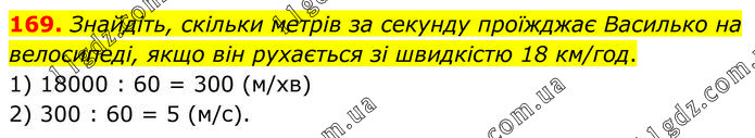Знайдіть, скільки метрів за секунду проїжджає Василько на велосипеді, якщо він рухається зі швидкістю 18 км/год. 1) 18000 : 60 = 300 (м/хв) 2) 300 : 60 = 5 (м/с).