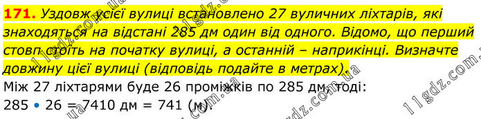 Уздовж усієї вулиці встановлено 27 вуличних ліхтарів, які знаходяться на відстані 285 дм один від одного. Відомо, що перший стовп стоїть на початку вулиці, а останній – наприкінці. Визначте довжину цієї вулиці (відповідь подайте в метрах). Між 27 ліхтарями буде 26 проміжків по 285 дм, тоді: 285 • 26 = 7410 дм = 741 (м).