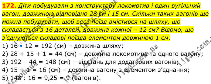 Діти побудували з конструктору локомотив і один вугільний вагон, довжиною відповідно 28 см і 15 см. Скільки таких вагонів ще можна побудувати, щоб весь поїзд вмістився на шляху, що складається з 16 деталей, довжина кожної – 12 см? Відомо, що з'єднуються складові поїзда елементом довжиною 1 см. 1) 16 • 12 = 192 (см) – довжина шляху; 2) 28 + 15 + 1 = 44 (см) – довжина локомотива та одного вагону; 3) 192 – 44 = 148 (см) – відстань для додаткових вагонів; 4) 15 + 1 = 16 (см) – довжина вагону з елементом з’єднання; 5) 148 : 16 = 9,25 = 9 (вагонів).