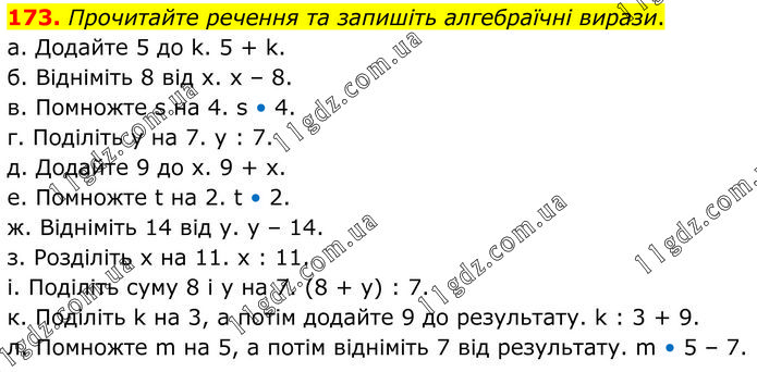 Прочитайте речення та запишіть алгебраїчні вирази. а. Додайте 5 до k. 5 + k. б. Відніміть 8 від x. x – 8. в. Помножте s на 4. s • 4. г. Поділіть y на 7. y : 7. д. Додайте 9 до x. 9 + x. е. Помножте t на 2. t • 2. ж. Відніміть 14 від y. y – 14. з. Розділіть х на 11. x : 11. і. Поділіть суму 8 і y на 7. (8 + y) : 7. к. Поділіть k на 3, а потім додайте 9 до результату. k : 3 + 9. л. Помножте m на 5, а потім відніміть 7 від результату. m • 5 – 7.