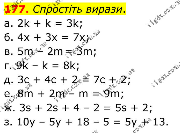 Спростіть вирази. а. 2k + k = 3k; б. 4x + 3х = 7x; в. 5m – 2m = 3m; г. 9k – k = 8k; д. 3c + 4c + 2 = 7c + 2; е. 8m + 2m – m = 9m; ж. 3s + 2s + 4 – 2 = 5s + 2; з. 10y – 5y + 18 – 5 = 5y + 13.
