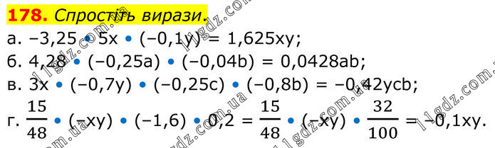 Спростіть вирази. а. –3,25 • 5х • (–0,1у) = 1,625xy; б. 4,28 • (–0,25а) • (–0,04b) = 0,0428ab; в. 3х • (–0,7у) • (–0,25с) • (–0,8b) = –0,42ycb; г. 15/48 • (–ху) • (–1,6) • 0,2 = 15/48 • (–ху) • 32/100 = –0,1xy.