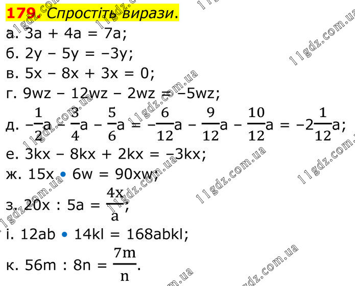 Спростіть вирази. a. 3а + 4а = 7a; б. 2y – 5у = –3y; в. 5х – 8x + 3х = 0; г. 9wz – 12wz – 2wz = –5wz; д. –1/2а – 3/4а – 5/6а = –6/12а – 9/12а – 10/12а = –21/12а; е. 3kx – 8kx + 2kx = –3kx; ж. 15x • 6w = 90xw; з. 20x : 5а = 4x/a; і. 12аb • 14kl = 168abkl; к. 56m : 8n = 7m/n.