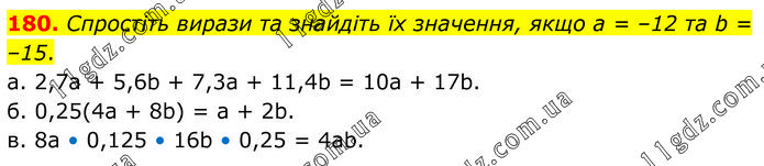 Спростіть вирази та знайдіть їх значення, якщо а = –12 та b = –15. а. 2,7а + 5,6b + 7,3а + 11,4b = 10a + 17b. б. 0,25(4а + 8b) = a + 2b. в. 8а • 0,125 • 16b • 0,25 = 4ab.