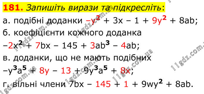 Запишіть вирази та підкресліть: а. подібні доданки –у2 + 3x – 1 + 9у2 + 8ab; б. коефіцієнти кожного доданка –2x2 + 7bx – 145 + 3ab3 – 4аb; в. доданки, що не мають подібних –у3а5 + 8у – 13 + 9у3а5 + 8x; г. вільні члени 7bx – 145 + 1 + 9wy2 + 8аb.