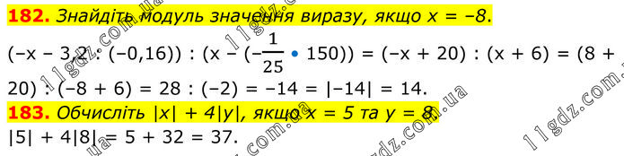 182. Знайдіть модуль значення виразу, якщо х = –8. (–х – 3,2 : (–0,16)) : (х – (–1/25 • 150)) = (–х + 20) : (х + 6) = (8 + 20) : (–8 + 6) = 28 : (–2) = –14 = |–14| = 14. 183. Обчисліть |x| + 4|y|, якщо x = 5 та y = 8. |5| + 4|8| = 5 + 32 = 37.
