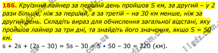 Круїзний лайнер за перший день пройшов S км, за другий – у 2 рази більше, ніж за перший, а за третій – на 30 км менше, ніж за другий день. Складіть вираз для обчислення загальної відстані, яку пройшов лайнер за три дні, та знайдіть його значення, якщо S = 50 км. s + 2s + (2s – 30) = 5s – 30 = 5 • 50 – 30 = 220 (км).