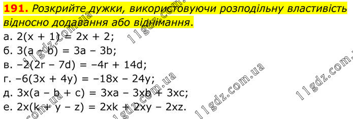 Розкрийте дужки, використовуючи розподільну властивість відносно додавання або віднімання. а. 2(x + 1) = 2x + 2; б. 3(а – b) = 3a – 3b; в. –2(2r – 7d) = –4r + 14d; г. –6(3x + 4у) = –18x – 24y; д. 3x(а – b + с) = 3xa – 3xb + 3xc; е. 2x(k + у – z) = 2xk + 2xy – 2xz.