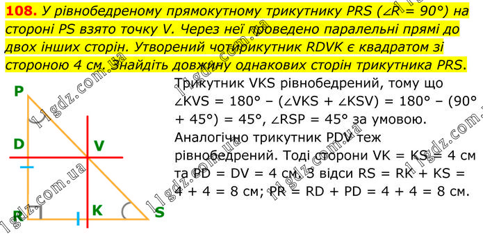 У рівнобедреному прямокутному трикутнику PRS (∠R = 90°) на стороні PS взято точку V. Через неї проведено паралельні прямі до двох інших сторін. Утворений чотирикутник RDVK є квадратом зі стороною 4 см. Знайдіть довжину однакових сторін трикутника PRS. Трикутник VKS рівнобедрений, тому що ∠KVS = 180° – (∠VKS + ∠KSV) = 180° – (90° + 45°) = 45°, ∠RSP = 45° за умовою. Аналогічно трикутник PDV теж рівнобедрений. Тоді сторони VK = KS = 4 см та PD = DV = 4 см. З відси RS = RK + KS = 4 + 4 = 8 см; PR = RD + PD = 4 + 4 = 8 см.