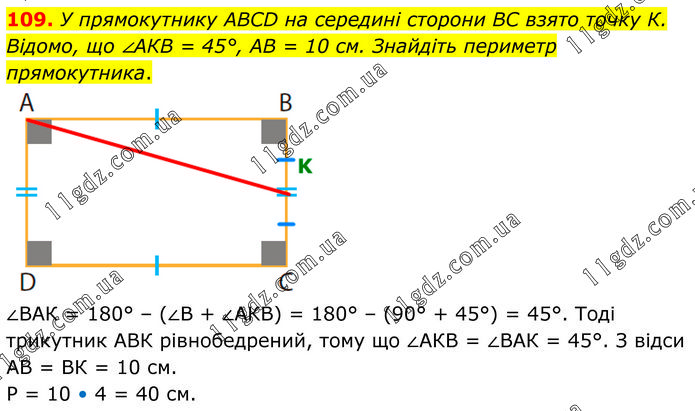 У прямокутнику ABCD на середині сторони ВС взято точку К. Відомо, що ∠АКВ = 45°, АВ = 10 см. Знайдіть периметр прямокутника. ∠ВАК = 180° – (∠В + ∠АКВ) = 180° – (90° + 45°) = 45°. Тоді трикутник АВК рівнобедрений, тому що ∠АКВ = ∠ВАК = 45°. З відси АВ = ВК = 10 см. Р = 10 • 4 = 40 см.