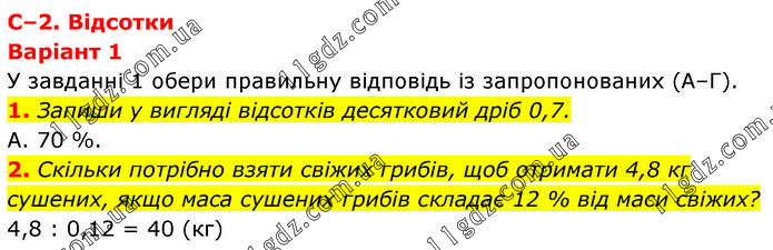 1. Запиши у вигляді відсотків десятковий дріб 0,7. А. 70 %. 2. Скільки потрібно взяти свіжих грибів, щоб отримати 4,8 кг сушених, якщо маса сушених грибів складає 12 % від маси свіжих? 4,8 : 0,12 = 40 (кг)