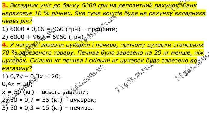 3. Вкладник уніс до банку 6000 грн на депозитний рахунок. Банк нараховує 16 % річних. Яка сума коштів буде на рахунку вкладника через рік? 1) 6000 • 0,16 = 960 (грн) – проценти; 2) 6000 + 960 = 6960 (грн) 4. У магазин завезли цукерки і печиво, причому цукерки становили 70 % завезеного товару. Печива було завезено на 20 кг менше, ніж цукерок. Скільки кг печива і скільки кг цукерок було завезено до магазину? 1) 0,7х – 0,3х = 20; 0,4х = 20; х = 50 (кг) – всього завезли; 2) 50 • 0,7 = 35 (кг) – цукерок; 3) 50 • 0,3 = 15 (кг) – печива.