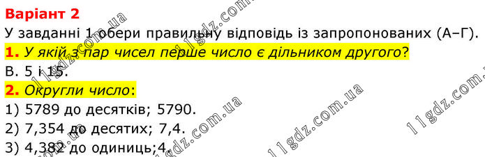 1. У якій з пар чисел перше число є дільником другого? В. 5 і 15. 2. Округли число: 1) 5789 до десятків; 5790. 2) 7,354 до десятих; 7,4. 3) 4,382 до одиниць;4.