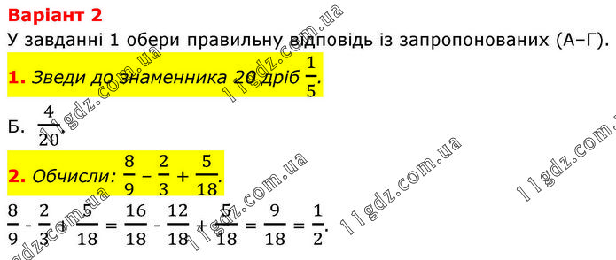1. Зведи до знаменника 20 дріб 1/5. Б. 4/20. 2. Обчисли: 8/9 – 2/3 + 5/18. 8/9 - 2/3 + 5/18 = 16/18 - 12/18 + 5/18 = 9/18 = 1/2.