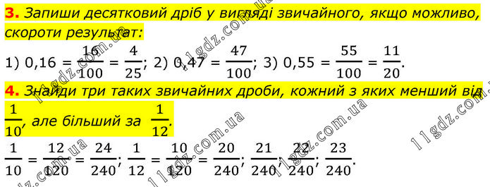 3. Запиши десятковий дріб у вигляді звичайного, якщо можливо, скороти результат: 1) 0,16 = 16/100 = 4/25; 2) 0,47 = 47/100; 3) 0,55 = 55/100 = 11/20. 4. Знайди три таких звичайних дроби, кожний з яких менший від 1/10, але більший за 1/12. 1/10 = 12/120 = 24/240; 1/12 = 10/120 = 20/240; 21/240; 22/240; 23/240.