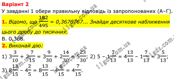 1. Відомо, що 182/495 = 0,3676767... Знайди десяткове наближення цього дробу до тисячних. В. 0,368. 2. Виконай дію: 1) 33/10 + 27/15 = 39/30 + 214/30 = 523/30; 2) 5 – 17/13 = 413/13 – 17/13 = 35/13; 3) 813/15 – 42/5 = 813/15 – 46/15 = 47/15.