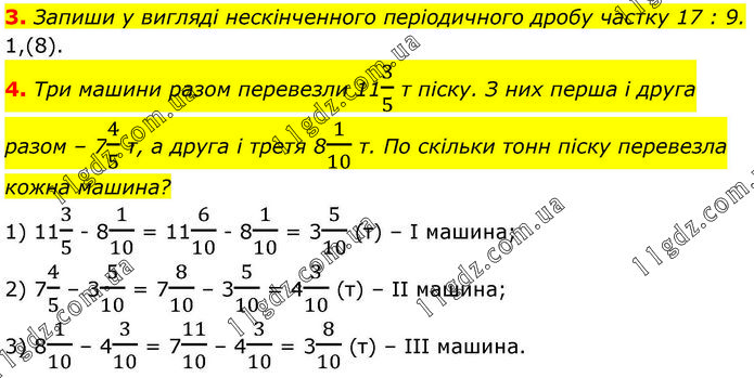 3. Запиши у вигляді нескінченного періодичного дробу частку 17 : 9. 1,(8). 4. Три машини разом перевезли 113/5 т піску. З них перша і друга разом – 74/5 т, а друга і третя 81/10 т. По скільки тонн піску перевезла кожна машина? 1) 113/5 - 81/10 = 116/10 - 81/10 = 35/10 (т) – І машина; 2) 74/5 – 35/10 = 78/10 – 35/10 = 43/10 (т) – ІІ машина; 3) 81/10 – 43/10 = 711/10 – 43/10 = 38/10 (т) – ІІІ машина.
