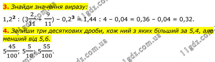 3. Знайди значення виразу: 1,22 : (32/11 + 9/11) – 0,23 = 1,44 : 4 – 0,04 = 0,36 – 0,04 = 0,32. 4. Запиши три десяткових дроби, кож ний з яких більший за 5,4, але менший від 5,6. 545/100; 55/10; 555/100.