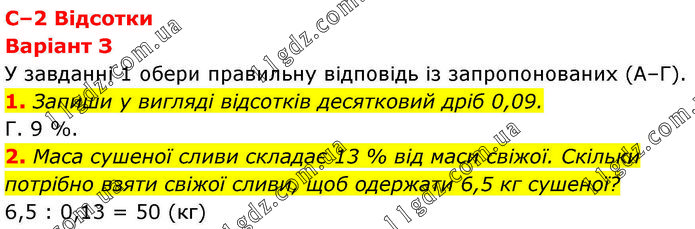 1. Запиши у вигляді відсотків десятковий дріб 0,09. Г. 9 %. 2. Маса сушеної сливи складає 13 % від маси свіжої. Скільки потрібно взяти свіжої сливи, щоб одержати 6,5 кг сушеної? 6,5 : 0,13 = 50 (кг)