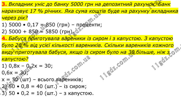 3. Вкладник уніс до банку 5000 грн на депозитний рахунок. Банк нараховує 17 % річних. Яка сума коштів буде на рахунку вкладника через рік? 1) 5000 • 0,17 = 850 (грн) – проценти; 2) 5000 + 850 = 5850 (грн). 4. Бабуся приготувала вареники із сиром і з капустою. З капустою було 20 % від усієї кількості вареників. Скільки вареників кожного виду приготувала бабуся, якщо із сиром було на 30 більше, ніж з капустою? 1) 0,8х – 0,2х = 30; 0,6х = 30; х = 50 (шт) – всього вареників; 2) 50 • 0,8 = 40 (шт.) – із сиром; 3) 50 • 0,2 = 10 (шт.) – з капустою.