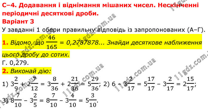 1. Відомо, що 46/165 = 0,2787878... Знайди десяткове наближення цього дробу до сотих. Г. 0,279. 2. Виконай дію: 1) 32/9 + 27/12 = 38/36 + 221/36 = 529/36; 2) 6 – 32/17 = 517/17 – 32/17 = 215/17; 3) 87/10 – 32/5 = 87/10 – 34/10 = 53/10.