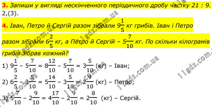 3. Запиши у вигляді нескінченного періодичного дробу частку 21 : 9. 2,(3). 4. Іван, Петро й Сергій разом зібрали 91/5 кг грибів. Іван і Петро разом зібрали 62/5 кг, а Петро й Сергій – 57/10 кг. По скільки кілограмів грибів зібрав кожний? 1) 91/5 – 57/10 = 812/10 – 57/10 = 35/10 (кг) – Іван; 2) 62/5 – 35/10 = 514/10 – 35/10 = 29/10 (кг) – Петро; 3) 57/10 – 29/10 = 417/10 – 29/10 = 28/10 (кг) – Сергій.