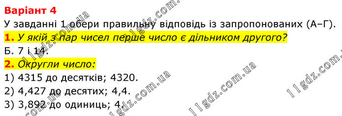 1. У якій з пар чисел перше число є дільником другого? Б. 7 і 14. 2. Округли число: 1) 4315 до десятків; 4320. 2) 4,427 до десятих; 4,4. 3) 3,892 до одиниць; 4.