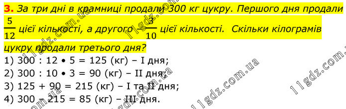 3. За три дні в крамниці продали 300 кг цукру. Першого дня продали 5/12 цієї кількості, а другого – 3/10 цієї кількості. Скільки кілограмів цукру продали третього дня? 1) 300 : 12 • 5 = 125 (кг) – І дня; 2) 300 : 10 • 3 = 90 (кг) – ІІ дня; 3) 125 + 90 = 215 (кг) – І та ІІ дня; 4) 300 – 215 = 85 (кг) – ІІІ дня.