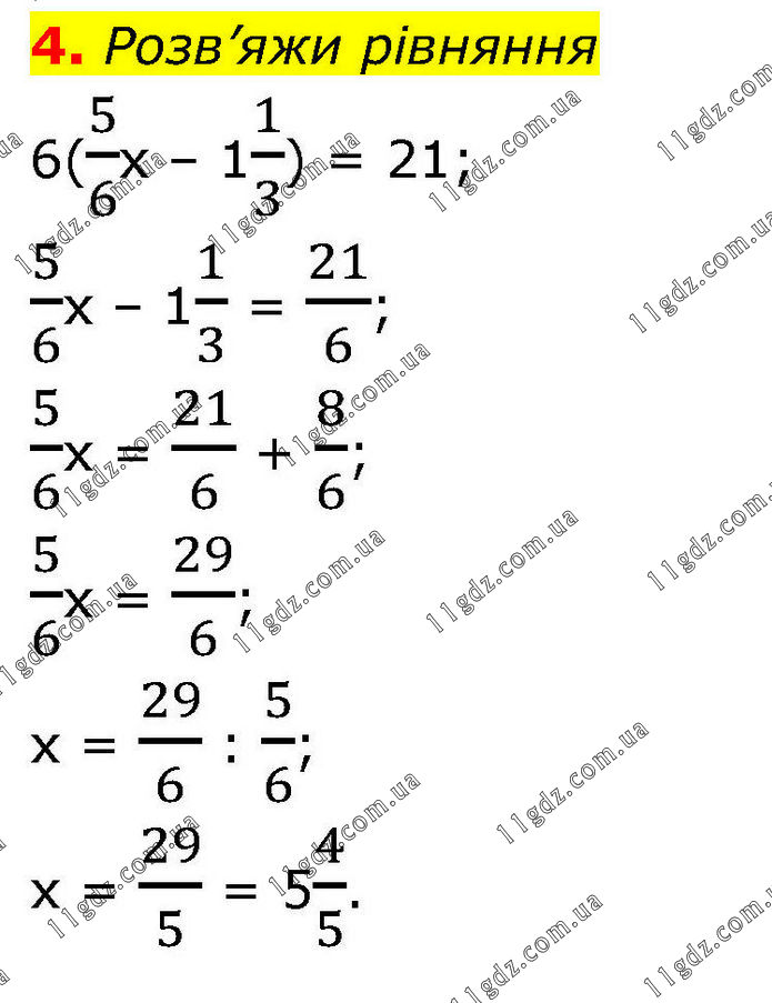 Розв’яжи рівняння 6(5/6х – 11/3) = 21; 5/6х – 11/3 = 21/6; 5/6х = 21/6 + 8/6; 5/6х = 29/6; х = 29/6 : 5/6; х = 29/5 = 54/5.
