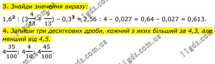 3. Знайди значення виразу: 1,62 : (34/13 + 9/13) – 0,33 = 2,56 : 4 – 0,027 = 0,64 – 0,027 = 0,613. 4. Запиши три десяткових дроби, кожний з яких більший за 4,3, але менший від 4,5. 435/100; 44/10; 445/100.