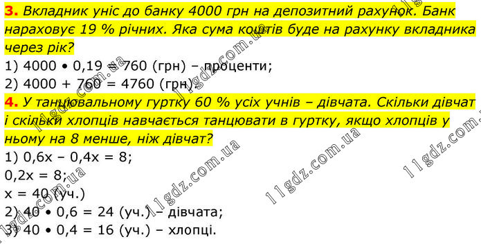 3. Вкладник уніс до банку 4000 грн на депозитний рахунок. Банк нараховує 19 % річних. Яка сума коштів буде на рахунку вкладника через рік? 1) 4000 • 0,19 = 760 (грн) – проценти; 2) 4000 + 760 = 4760 (грн). 4. У танцювальному гуртку 60 % усіх учнів – дівчата. Скільки дівчат і скільки хлопців навчається танцювати в гуртку, якщо хлопців у ньому на 8 менше, ніж дівчат? 1) 0,6х – 0,4х = 8; 0,2х = 8; х = 40 (уч.) 2) 40 • 0,6 = 24 (уч.) – дівчата; 3) 40 • 0,4 = 16 (уч.) – хлопці.