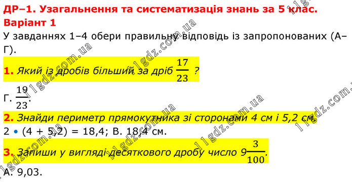 1. Який із дробів більший за дріб 17/23 ? Г. 19/23. 2. Знайди периметр прямокутника зі сторонами 4 см і 5,2 см. 2 • (4 + 5,2) = 18,4; В. 18,4 см. 3. Запиши у вигляді десяткового дробу число 93/100. А. 9,03.