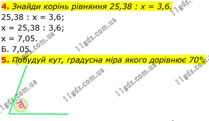 4. Знайди корінь рівняння 25,38 : х = 3,6. 25,38 : х = 3,6; х = 25,38 : 3,6; х = 7,05. Б. 7,05. 5. Побудуй кут, градусна міра якого дорівнює 70°.