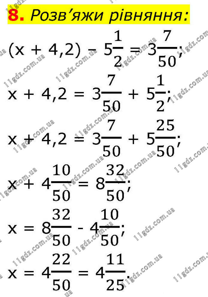 8. Розв’яжи рівняння: (х + 4,2) – 51/2 = 37/50; х + 4,2 = 37/50 + 51/2; х + 4,2 = 37/50 + 525/50; х + 410/50 = 832/50; х = 832/50 - 410/50; х = 422/50 = 411/25.