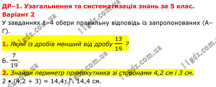 1. Який із дробів менший від дробу 13/19 ? Б. 7/19. 2. Знайди периметр прямокутника зі сторонами 4,2 см і 3 см. 2 • (4,2 + 3) = 14,4; Г. 14,4 см.