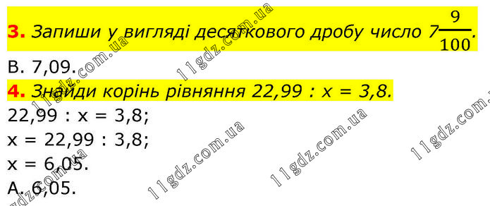 3. Запиши у вигляді десяткового дробу число 79/100. В. 7,09. 4. Знайди корінь рівняння 22,99 : х = 3,8. 22,99 : х = 3,8; х = 22,99 : 3,8; х = 6,05. А. 6,05.
