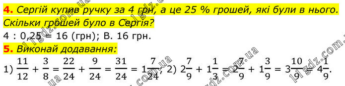 4. Сергій купив ручку за 4 грн, а це 25 % грошей, які були в нього. Скільки грошей було в Сергія? 4 : 0,25 = 16 (грн); В. 16 грн. 5. Виконай додавання: 1) 11/12 + 3/8 = 22/24 + 9/24 = 31/24 = 17/24; 2) 27/9 + 11/3 = 27/9 + 13/9 = 310/9 = 41/9.