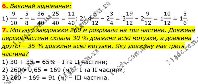 6. Виконай віднімання: 1) 9/10 – 5/8 = 36/40 – 25/40 = 11/40; 2) 47/12 – 23/4 = 319/12 – 29/12 = 110/12 = 15/6. 7. Мотузку завдовжки 260 м розрізали на три частини. Довжина першої частини склала 30 % довжини всієї мотузки, а довжина другої – 35 % довжини всієї мотузки. Яку довжину має третя частина? 1) 30 + 35 = 65% - І та ІІ частини; 2) 260 • 0,65 = 169 (м) – І та ІІ частини; 3) 260 – 169 = 91 (м) – ІІІ частина.