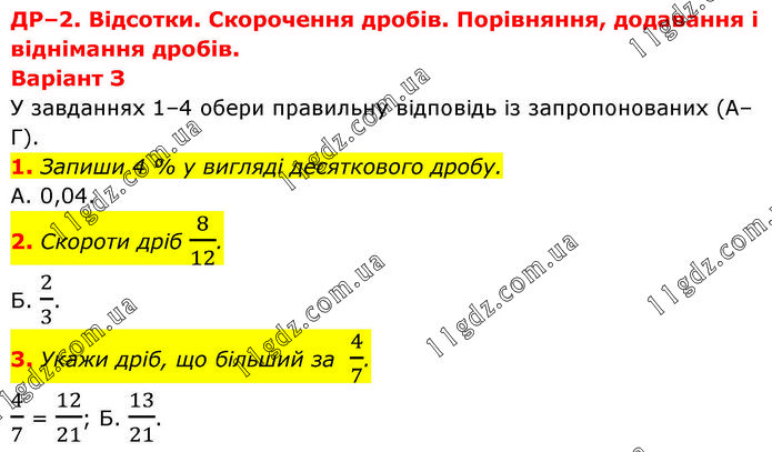 1. Запиши 4 % у вигляді десяткового дробу. А. 0,04. 2. Скороти дріб 8/12. Б. 2/3. 3. Укажи дріб, що більший за 4/7. 4/7 = 12/21; Б. 13/21.